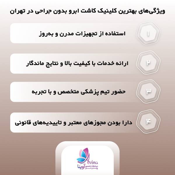برای انتخاب بهترین کلینیک کاشت ابرو بدون جراحی در تهران باید به چند معیار مهم توجه کرد؛ از جمله استفاده از روشهای نوین و بدون درد، بهرهمندی از کادر پزشکی متخصص در زمینه ترمیم ابرو، داشتن نمونهکارهای موفق و رضایت مراجعین قبلی، رعایت کامل اصول بهداشتی و ارائه مشاوره تخصصی پیش از شروع درمان. کلینیکی مثل کلینیک آوینا باتکیهبر تجهیزات پیشرفته و تکنیکهای غیرتهاجمی، میتواند گزینهای ایدهآل برای افرادی باشد که به دنبال نتایج طبیعی و ماندگار در کاشت ابرو بدون نیاز به جراحی هستند.